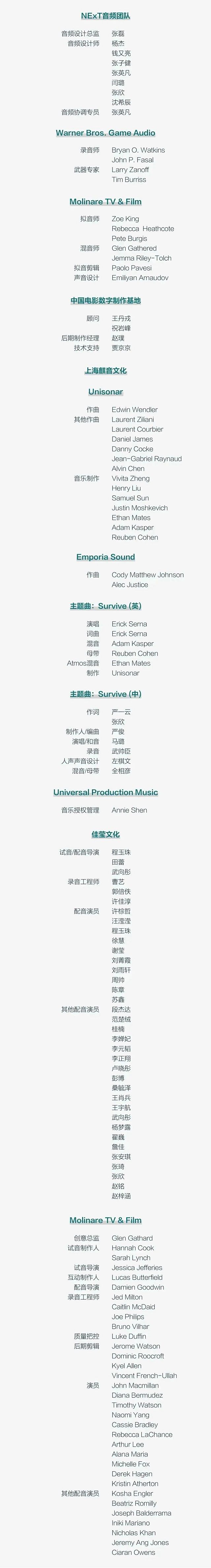 - 感谢NExT Studios音频团队的所有成员,音频设计师杨杰先生、钱又亮先生、张子健先生、张英凡先生、闫璐女士、张欣先生和沈希辰先生!